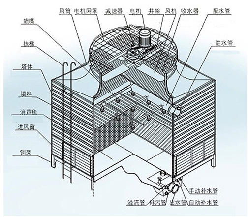 通過設備注入循環水,循環水通過開式冷卻塔以噴霧方式噴淋到玻璃纖維或其他材質的冷卻塔設備填料上,流經填料的循環水能夠以更大面積及更多時間與空氣相接觸,在接觸的過程通過熱轉移,達到換熱的效果。且開式冷卻塔可通過配套風機帶動塔內的氣流循環更加迅速,將與熱水熱能交換后的熱氣流快速排出,達到設備的冷卻效果。